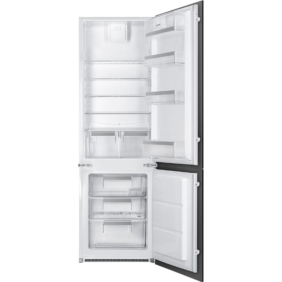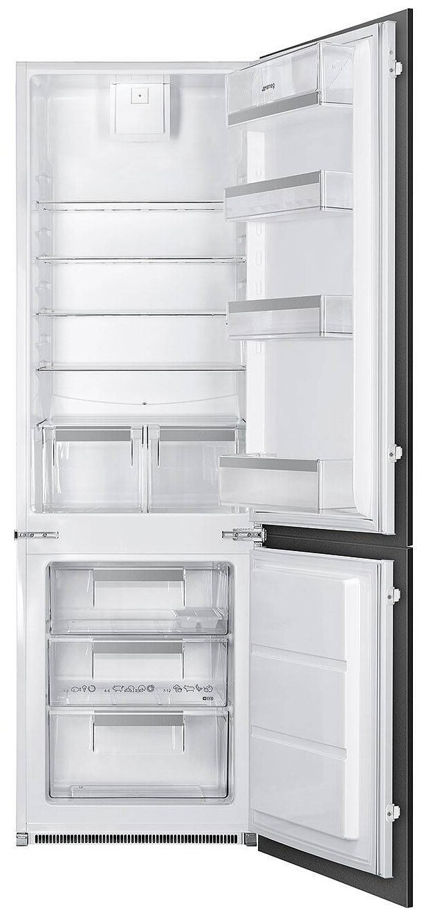 Встраиваемый холодильник SMEG C81721F предназначен для кратковременного хранения различных готовых блюд, охлаждённых продуктов и напитков, а также для заморозки и длительного хранения замороженных продуктов и полуфабрикатов. Полки на дверце пластиковые, с металлической окантовкой. Внутри холодильной камеры полки из закалённого стекла, благодаря чему выдерживают большую нагрузку. Данная модель идеально подходит для встраивания в объёмный гарнитур на просторной кухне.