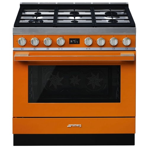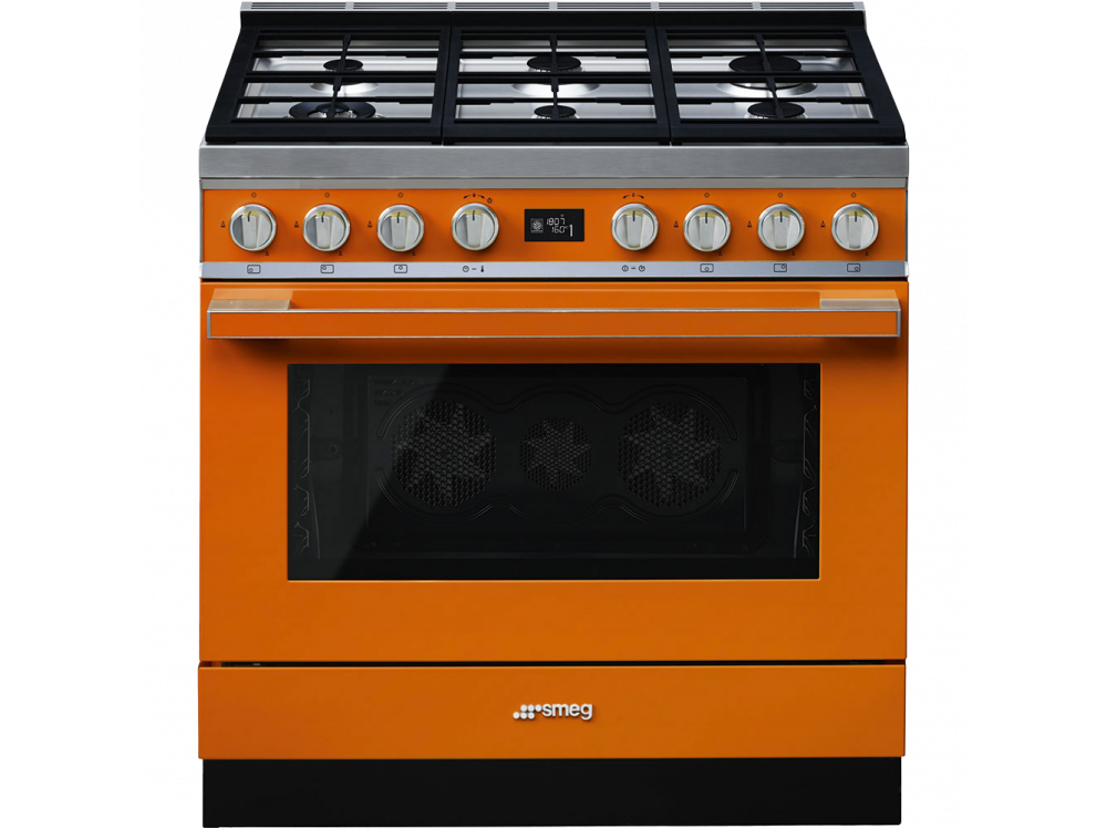 Варочный центр Smeg CPF9GPOR из серии Portofino выполнен в теплом оранжевом цвете. Конструкция включает наличие газовой варочной панели и электрического духового шкафа. Варочная поверхность имеет автоматический электроподжиг для быстрого зажигания пламени, а духовой шкаф оснащен функцией пиролитической очистки.