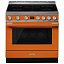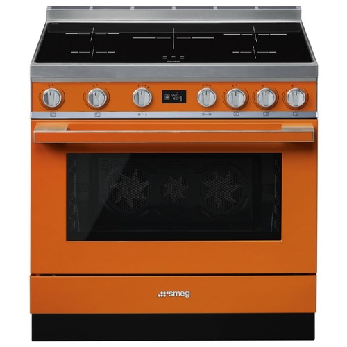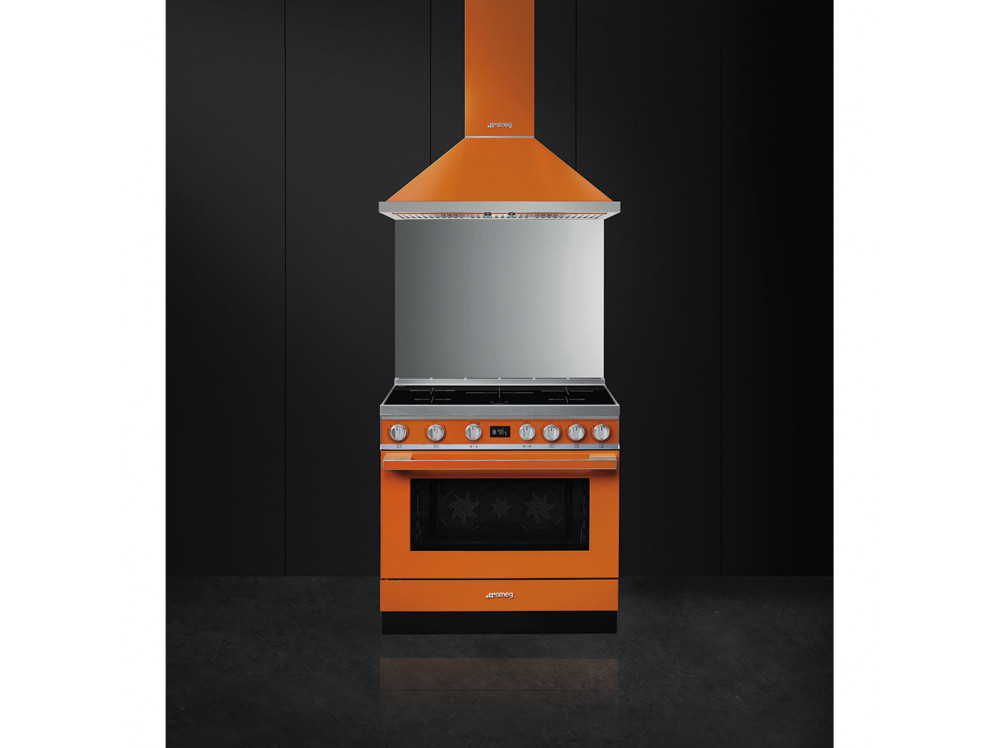 Варочный центр Smeg выполнен в оранжевом цвете. Удобные поворотные переключатели позволят точно и быстро настроить прибор, а на LCD-дисплее отображаются все процессы, которые происходят в камере. Данная модель предусматривает в себе 10 режимов нагрева, в числе которых «классический», «гриль» и 2 функции разморозки — по весу и по времени, с помощью которых можно разморозить десерты, овощи или готовую пищу. При работе программы пиролитической очистки, температура в духовом шкафу достигает 500 градусов Цельсия, благодаря чему, после ее окончания, достаточно смахнуть пыль, что делает уход за духовкой очень простым.