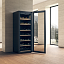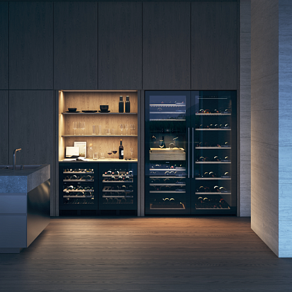• Внутри размещено 7 деревянных полок, гасящих вибрацию, на которых можно удобно уложить 261 бутылку. На каждом уровне есть специальная табличка для названия расположенных на ней напитков.